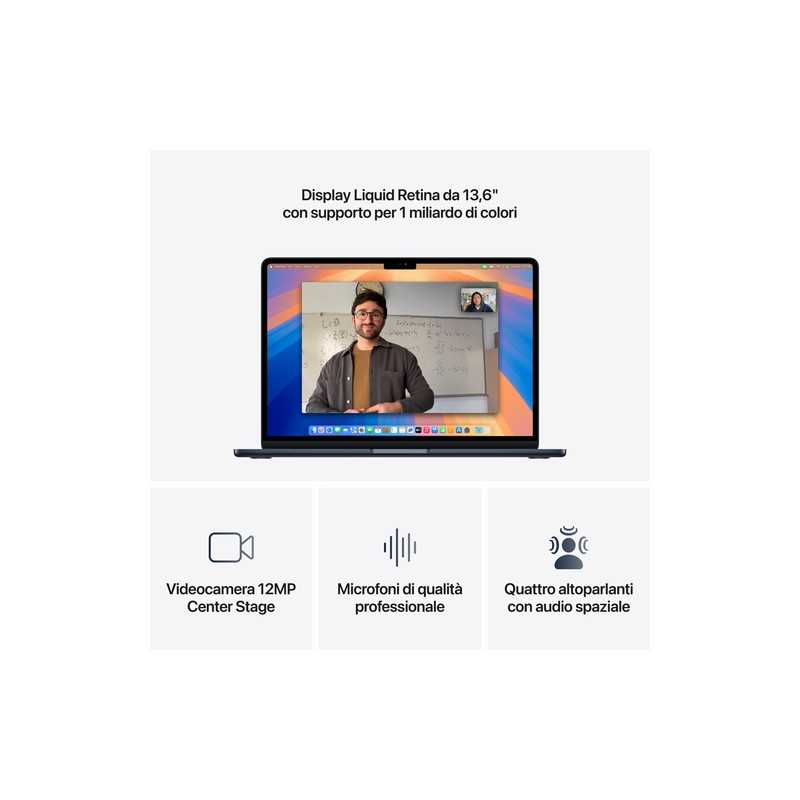 Il display Liquid Retina da 13.6 pollici è un vero spettacolo per gli occhi, con una risoluzione di 2560 x 1664 pixel che offre immagini nitide e colori vivaci. La tecnologia True Tone adatta automaticamente la temperatura del colore all'ambiente circostante, riducendo l'affaticamento degli occhi durante le lunghe sessioni di lavoro.