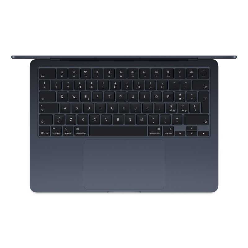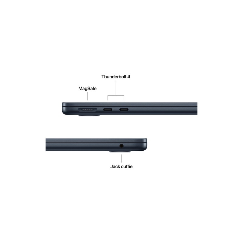Il design unibody in alluminio riciclato nella elegante colorazione Mezzanotte non solo è bello da vedere, ma anche rispettoso dell'ambiente. Con uno spessore di soli 11.3 mm e un peso di 1.24 kg, questo MacBook Air è il compagno ideale per professionisti in movimento, studenti e creativi che necessitano di potenza e portabilità.