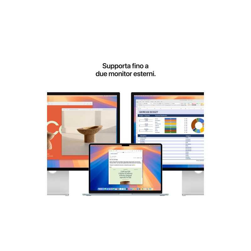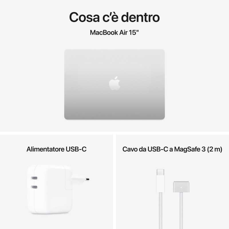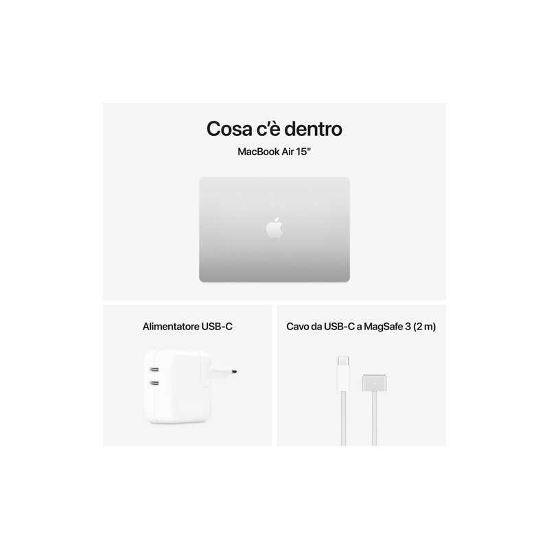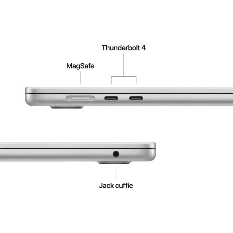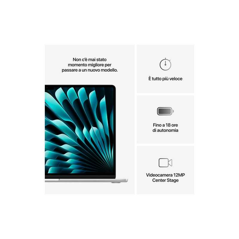Il display Liquid Retina da 15,3 pollici offre immagini nitide e colori vivaci, perfetto per la produttività e l'intrattenimento. La risoluzione elevata e la tecnologia True Tone assicurano un'esperienza visiva confortevole in ogni condizione di luce. Il design in alluminio argento non solo è esteticamente accattivante, ma anche incredibilmente resistente e leggero, rendendo questo MacBook Air il compagno ideale per chi è sempre in movimento.