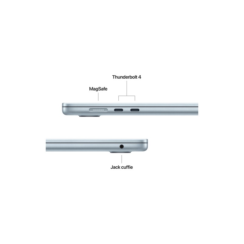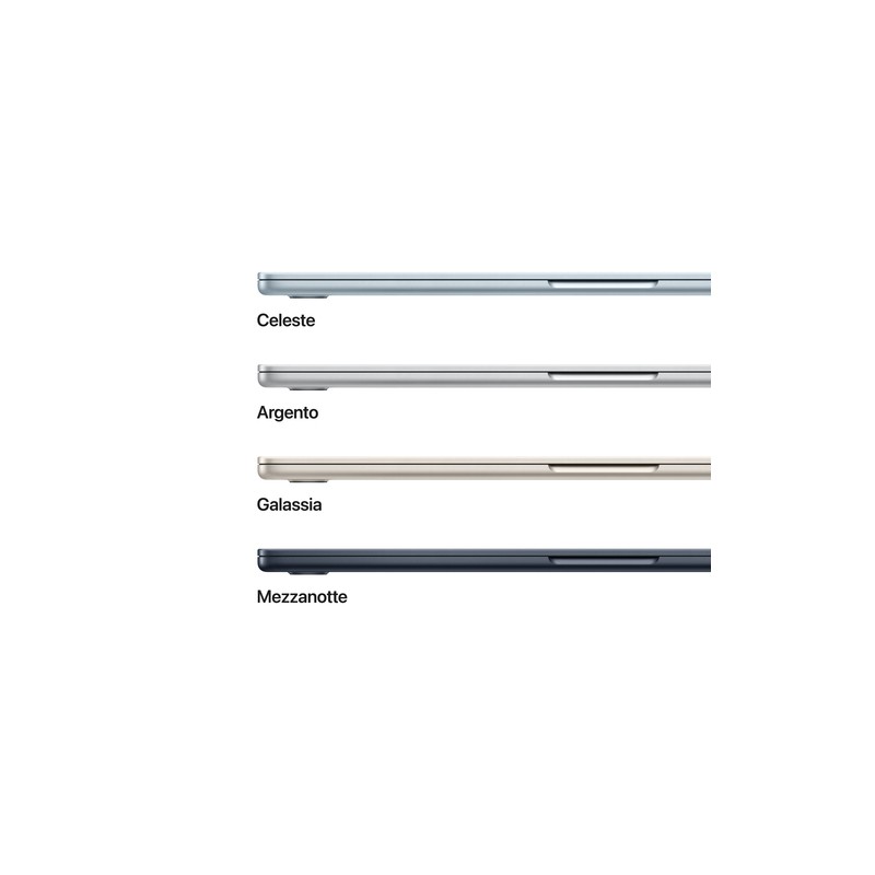 Il MacBook Air 15" vanta un magnifico display Liquid Retina da 15,3 pollici con una risoluzione di 2880 x 1864 pixel. I colori vividi, il contrasto elevato e la tecnologia True Tone offrono un'esperienza visiva immersiva, ideale per la creazione di contenuti, l'editing fotografico o semplicemente per godersi film e serie TV. Il design in alluminio celeste non solo è esteticamente accattivante, ma garantisce anche robustezza e leggerezza, con un peso di soli 1,51 kg e uno spessore di 11,5 mm.