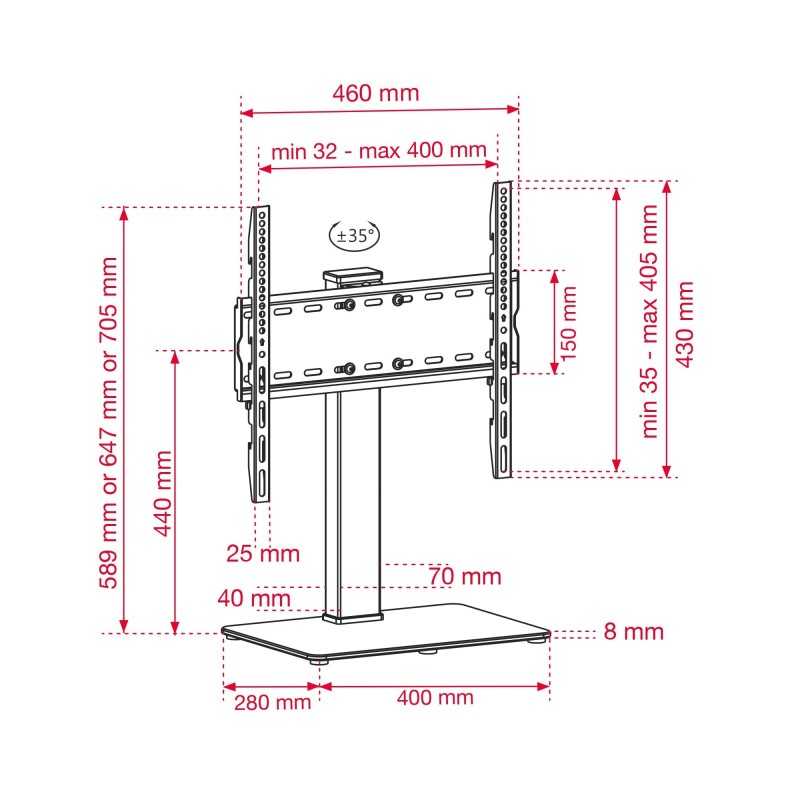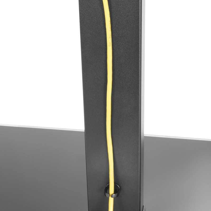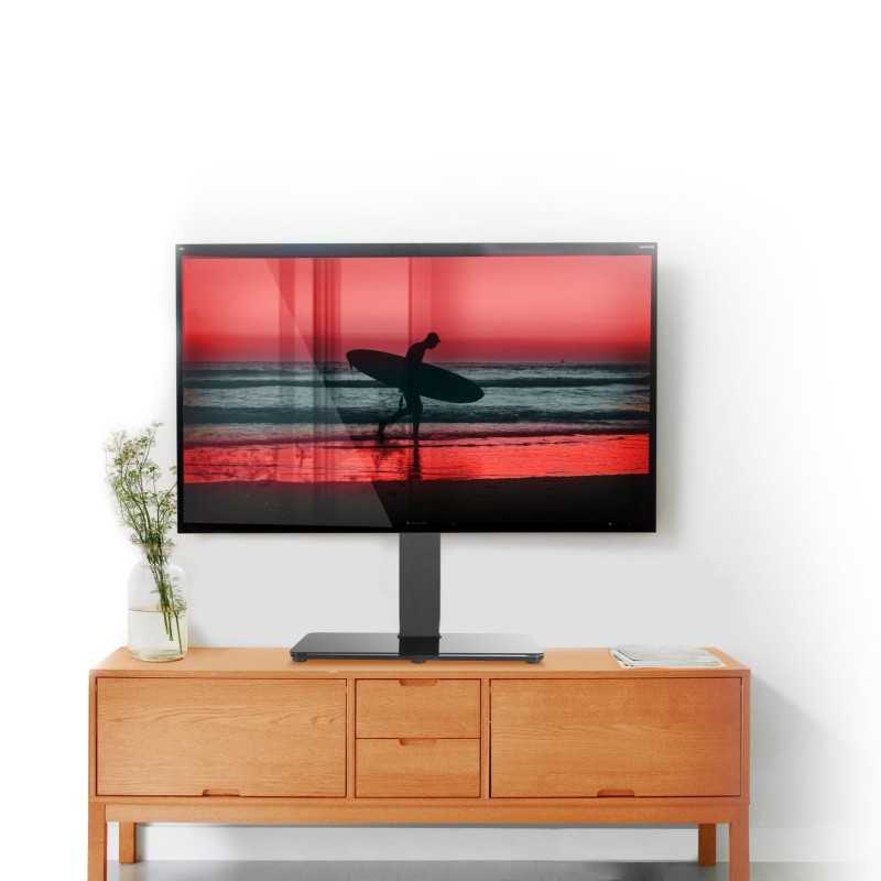 Realizzato con una base in vetro temperato nera, il supporto non solo è esteticamente gradevole, ma offre anche una stabilità eccezionale, riducendo il rischio di caduta dello schermo. Con una capacità di carico fino a 40 kg e compatibile con VESA 400 x 400 mm, è perfetto per la maggior parte dei televisori. La rotazione di 70° consente di ottenere sempre il miglior angolo di visione, eliminando riflessi e raggi di luce fastidiosi.