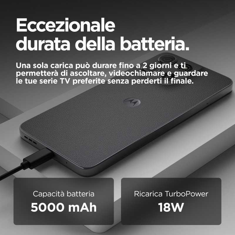 La batteria da 5200 mAh del Moto G15 assicura un'autonomia eccezionale, permettendoti di utilizzare il dispositivo per ore senza preoccuparti di rimanere senza energia. La tecnologia di ricarica rapida TurboPower ti permette di ricaricare velocemente il dispositivo, riducendo al minimo i tempi di inattività. Questa combinazione di capacità e velocità di ricarica rende il Moto G15 il compagno ideale per chi è sempre in movimento e ha bisogno di un dispositivo affidabile che duri tutto il giorno.