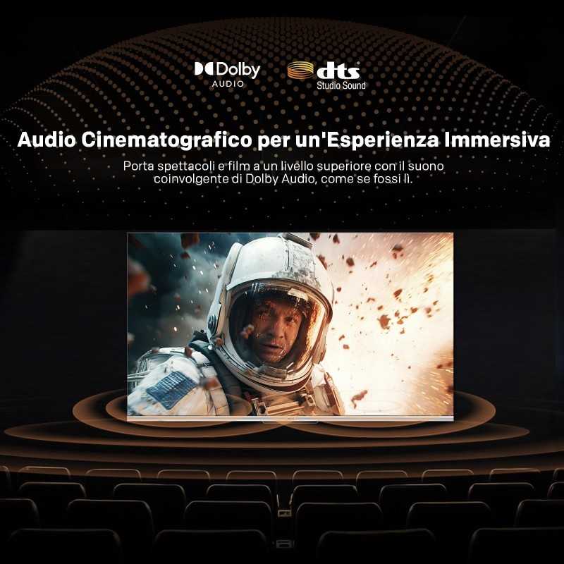 La tecnologia HDR supportata garantisce neri più profondi e luci più brillanti, rendendo ogni scena più coinvolgente. Con l'Assistente Google integrato, puoi controllare i tuoi dispositivi intelligenti e trovare contenuti semplicemente usando la tua voce. Inoltre, il TV è dotato di due altoparlanti integrati da 10W ciascuno, supportando Dolby Digital Plus e Dts Studio Sound Surround per un audio di alta qualità.
